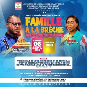Les Lundis, Mercredis , Vendredis chaque semain à 4H30 du matin en Côte D’Ivoire ( 6H30 en France ), Fabrice et Myriam Gballou animent un moment de prière avec différents thèmes pour vivre la foi chrétienne en compagnie de nombreux fidèles de la parole de Dieu. Une émission à suivre sur la page de la fraternité des flammes du saint esprit. A suivre.